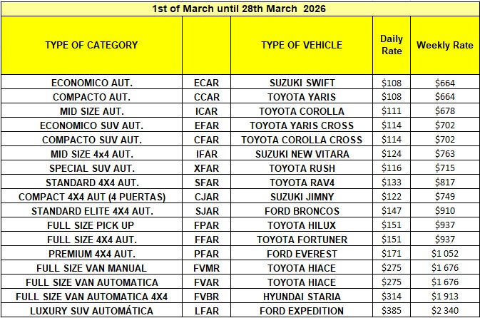 Alamo Car Rental Rates include : basic insurance TPI and CDW, taxes, non drop of fees and 2 drivers, possible to add Racks for  extra U$7 and child seats U$7